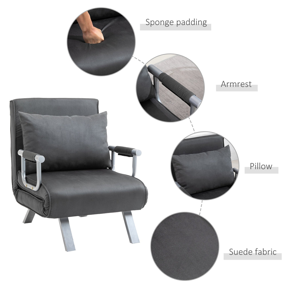 Switch from sitting to sleeping in an instant, thanks to this convertible chair from HOMCOM. It effortlessly combines comfort and style for a piece which looks just as good as it feels. Using steel for the frame, the structure is solid and tough, and features a five-level back to adjust to a position best for you. Filled with thick foam padding, it's wrapped in suedette upholstery which is beautifully soft to the touch. It comes complete with armrests, slanted legs for stability and a large pillow for extra comfort and support. Now your guests will always have somewhere cosy to sleep when they come over for the night.