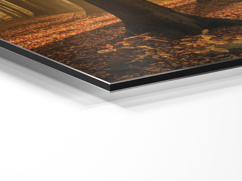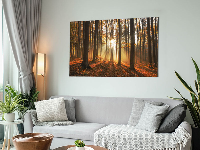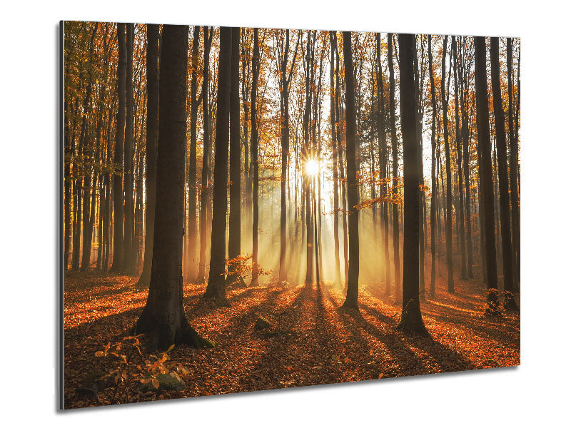 Sunbeam forest in the misty hues Printed on brushed aluminium dibond. A modern way to display art and easy to maintain.