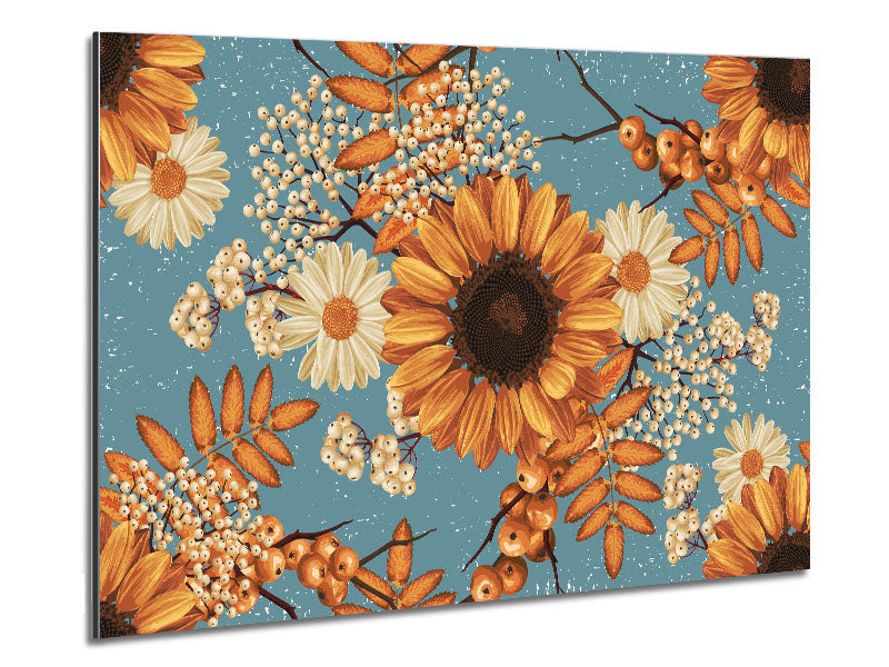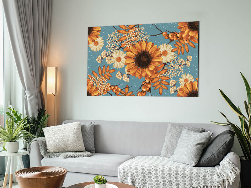 Sunflowers On Blue Printed on brushed aluminium dibond. A modern way to display art and easy to maintain.