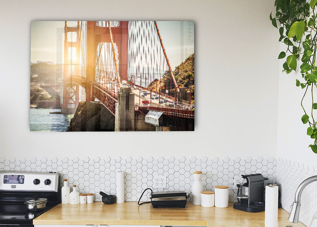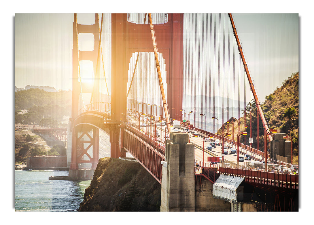 Sunrise Glow Over The Golden Gate Bridge acrylic print, UV printed onto 5mm thick acrylic glass. Comes with everything you need to hang on your wall.