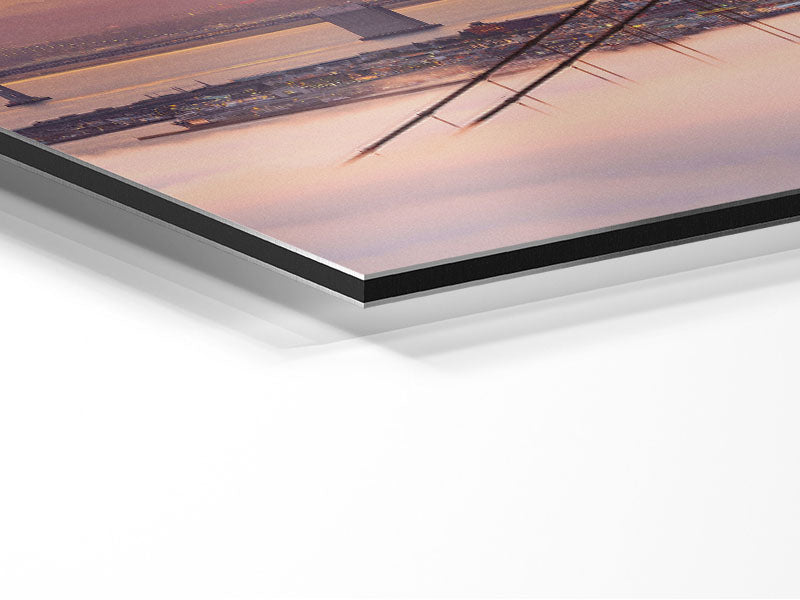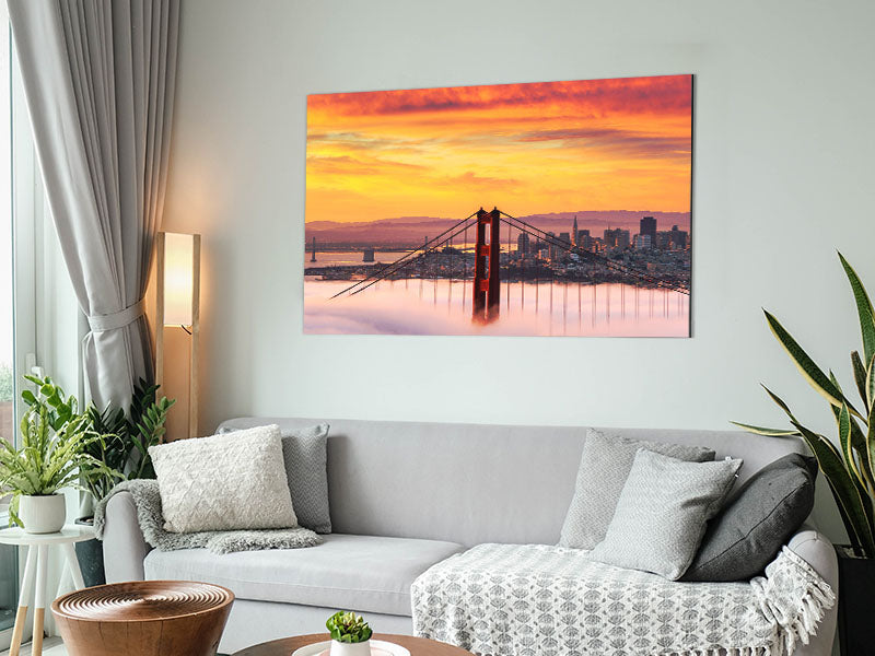 Sunset Mist Golden Gate Bridge Printed on brushed aluminium dibond. A modern way to display art and easy to maintain.
