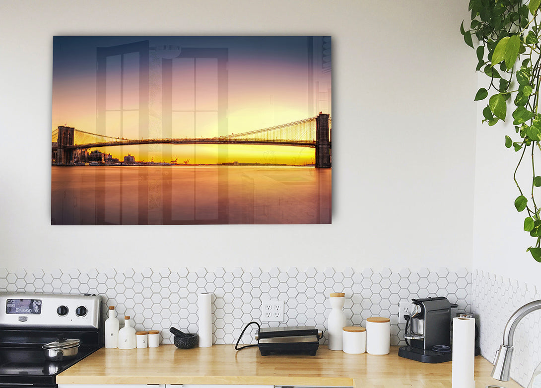 Sunset Over Brooklyn Bridge acrylic print, UV printed onto 5mm thick acrylic glass. Comes with everything you need to hang on your wall.