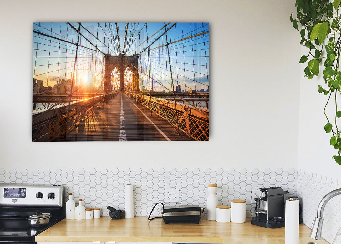 Sunset Through Brooklyn Bridge acrylic print, UV printed onto 5mm thick acrylic glass. Comes with everything you need to hang on your wall.