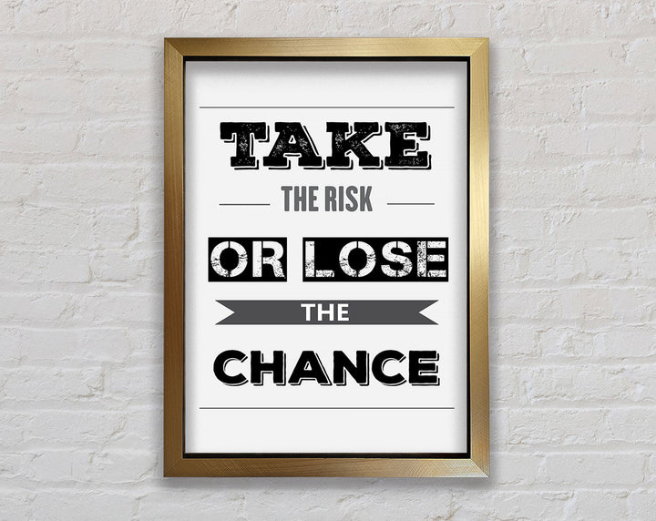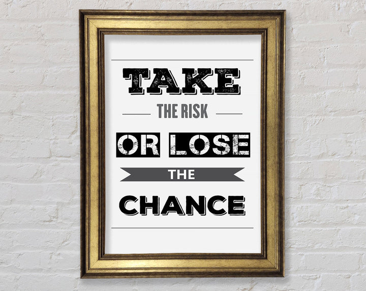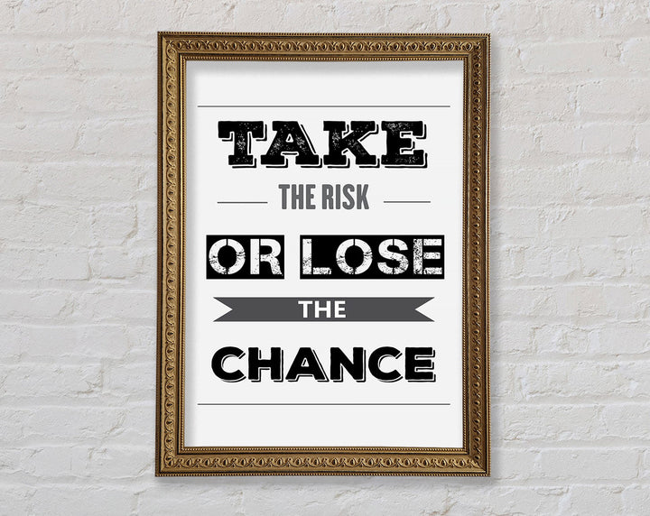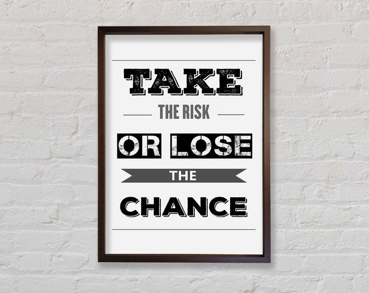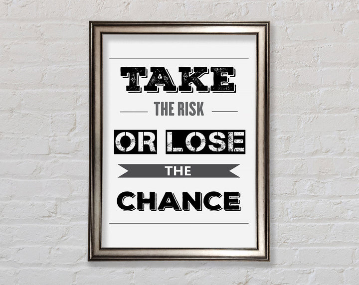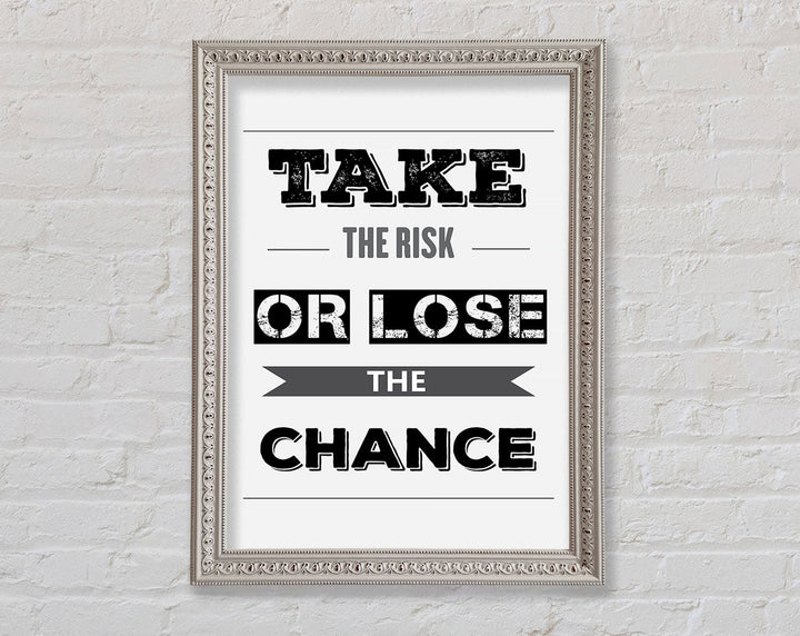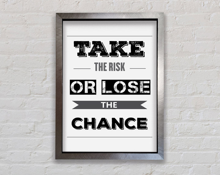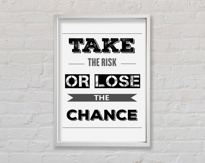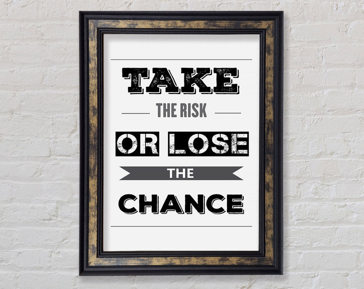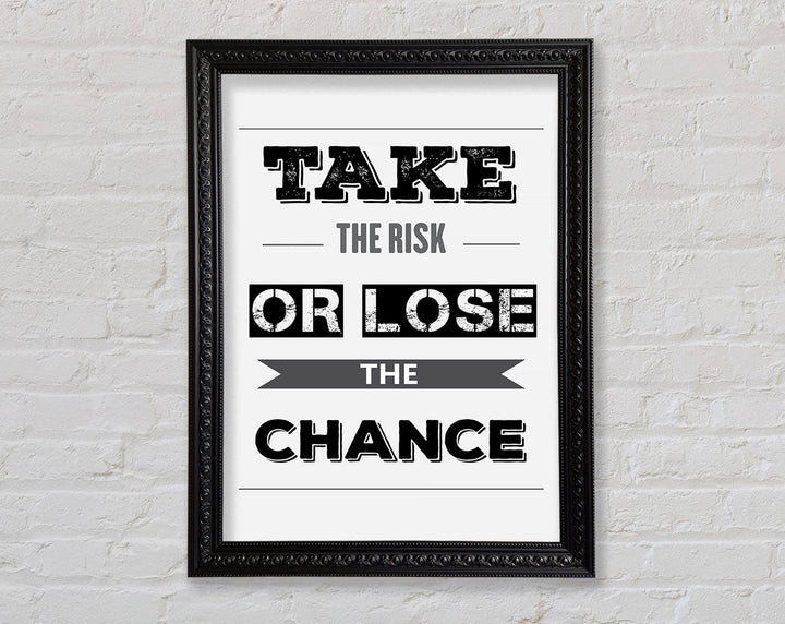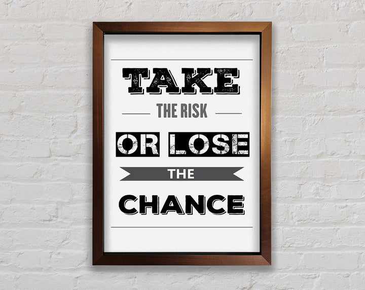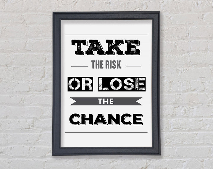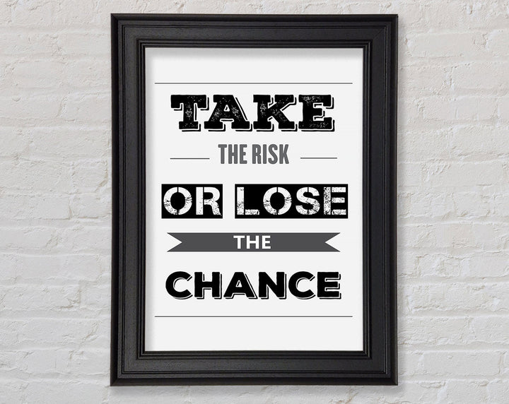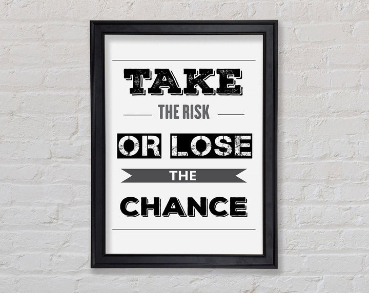 Introducing the Take The Risk Or Lose Framed Print, a stunning piece of framed art that inspires and motivates. Handmade in the United Kingdom, this print is available in six sizes, ranging from small to oversized, ensuring a perfect fit for any space. Choose from a variety of vibrant colors to match your decor. Each print comes ready to hang, making it easy to add a touch of elegance and inspiration to your home or office. The high-quality craftsmanship ensures durability, while the bold message serves as a daily reminder to embrace opportunities. Elevate your surroundings with this unique and meaningful piece of art.