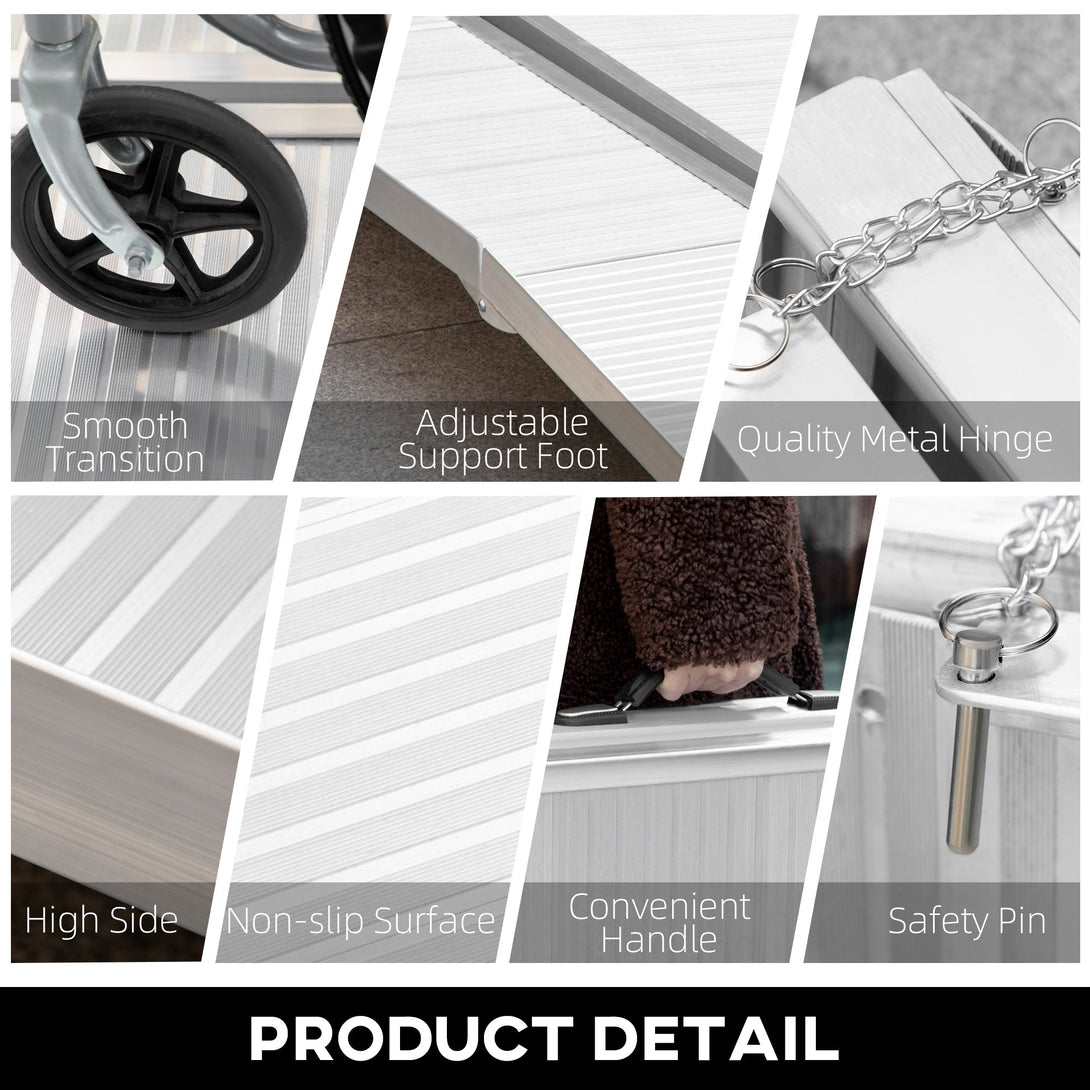 Let HOMCOM help create complete, easy mobility with our wheelchair ramp. Built from a sturdy, anti-corrosive aluminium alloy, this portable ramp uses a ribbed surface to prevent sliding in any weather and has two high side walls to help prevent accidental falls. The threshold ramps is 183cm long, and applicable height is 17-45cm, recommended height is 17-30cm. Not only for use with wheelchairs, this ramp provides ease of access for scooters, bikes and any other unwieldy wheeled object.