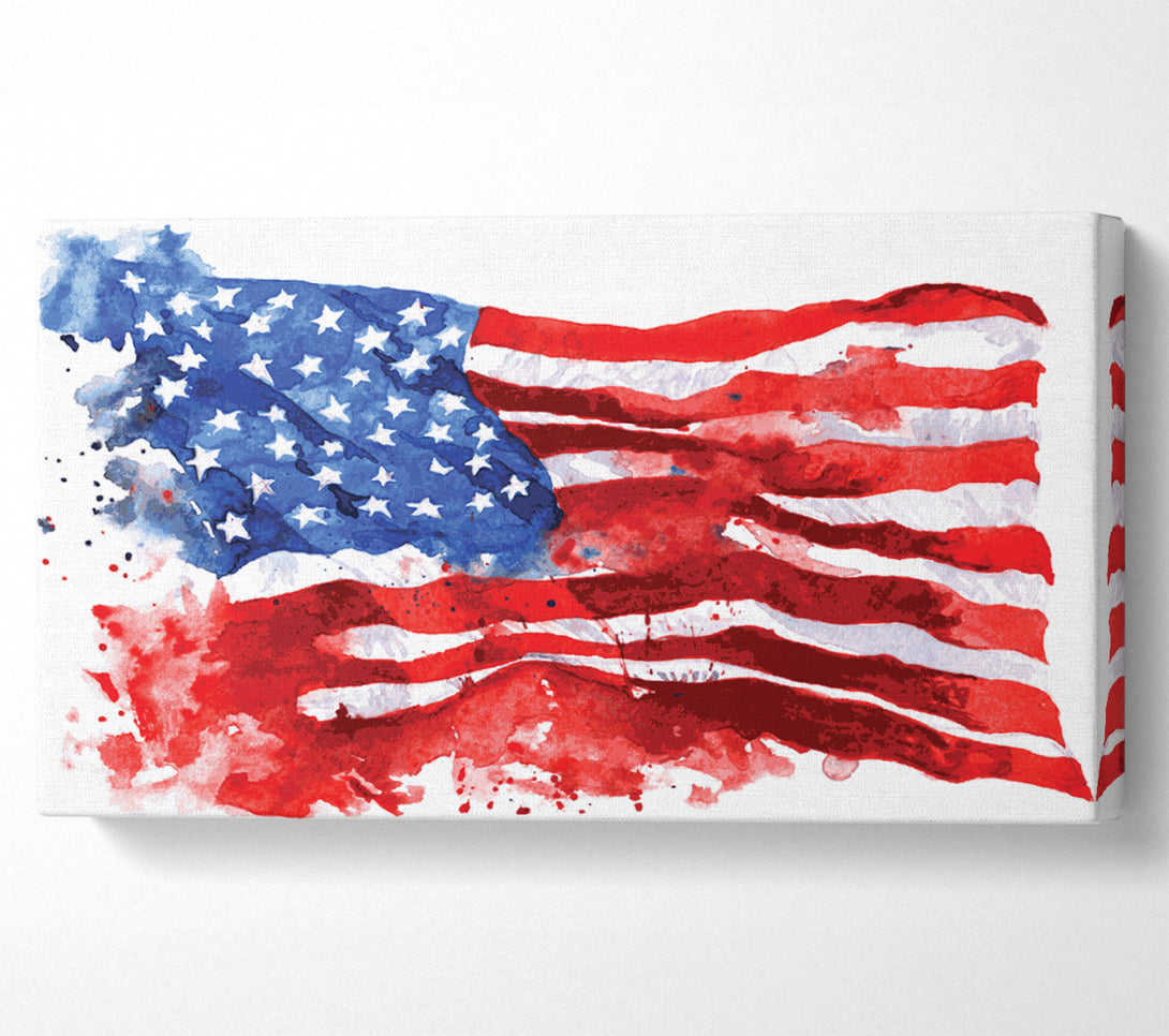 The Ink Splatter American Flag wide canvas, printed on coated polyester canvas. Mounted on to a 44mm box frame, ready to hang.