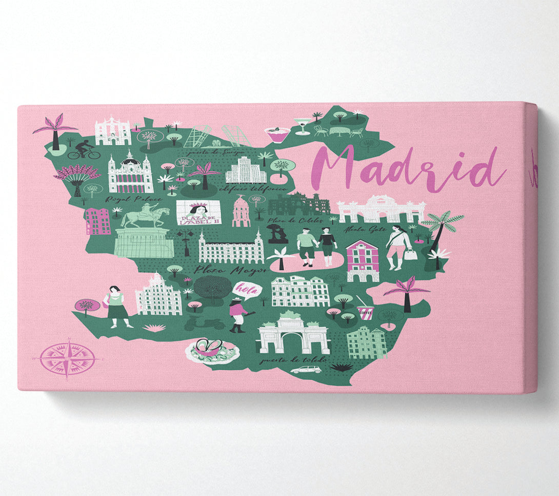 The Little Map Of Madrid wide canvas, printed on coated polyester canvas. Mounted on to a 44mm box frame, ready to hang.