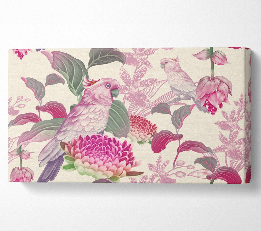 The Parrot Is Of Floral Pattern wide canvas, printed on coated polyester canvas. Mounted on to a 44mm box frame, ready to hang.