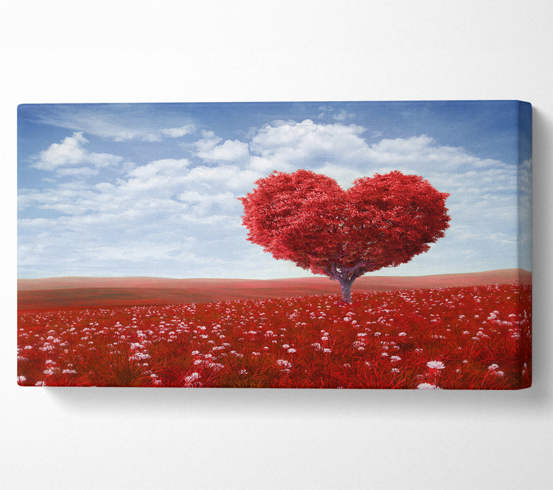 The Red Tree Heart wide canvas, printed on coated polyester canvas. Mounted on to a 44mm box frame, ready to hang.