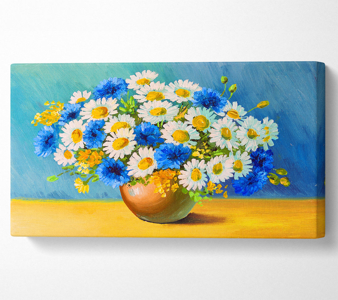The Vase Of Daisies wide canvas, printed on coated polyester canvas. Mounted on to a 44mm box frame, ready to hang.