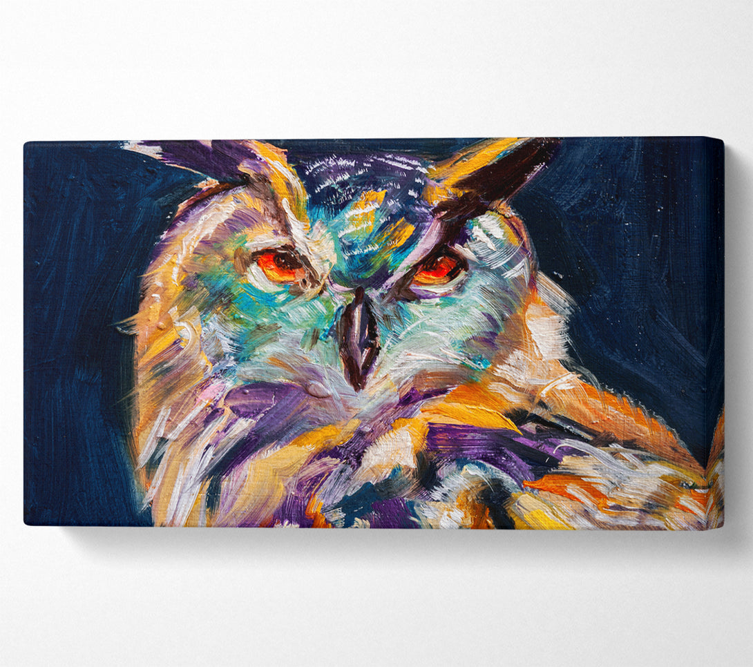 The Vivid Owl Stare wide canvas, printed on coated polyester canvas. Mounted on to a 44mm box frame, ready to hang.