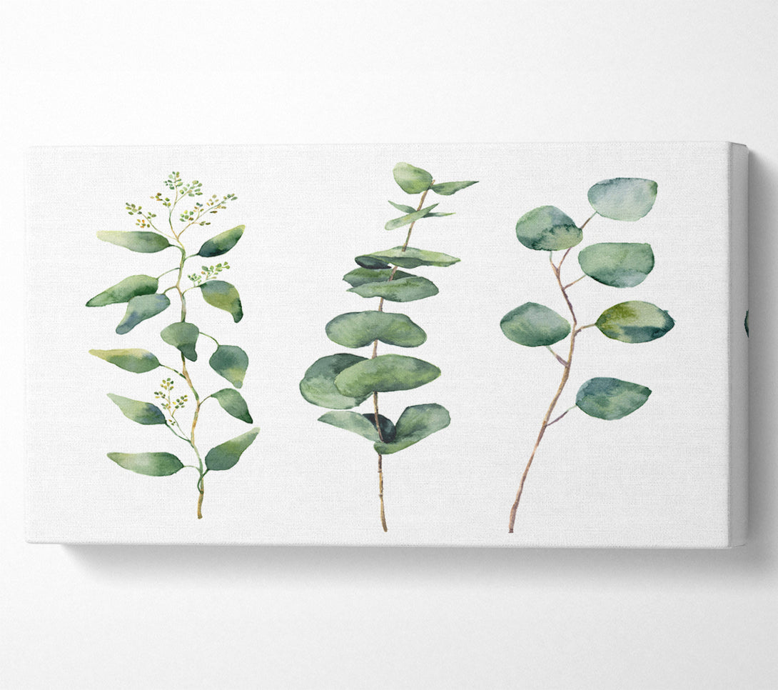 Three Green Foliage Stems wide canvas, printed on coated polyester canvas. Mounted on to a 44mm box frame, ready to hang.