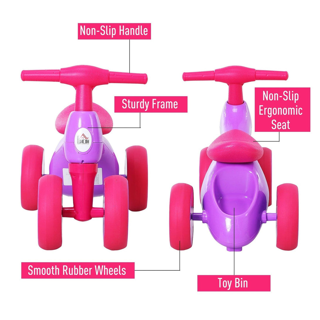 Introduce them to cycling in the easiest way possible with this pink and purple baby balance bike from HOMCOM. Made for children aged between 18 and 36 months, its lightweight and sturdy design features four large rubber wheels for a smooth and safe ride, a wide and slanted seat for support and comfort sitting, a low frame for ease getting on/off and a comfortable grip handles. With a limited steering range to help prevent the bike and your toddler from falling over, it is finished with a toy bin at the back so they can bring their favourite teddy along with them for the journey. A great way for them to have fun whilst learning too.