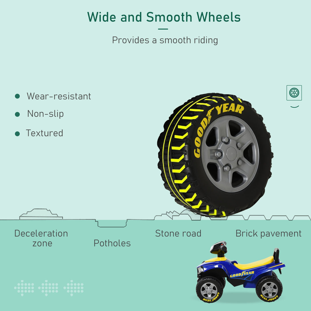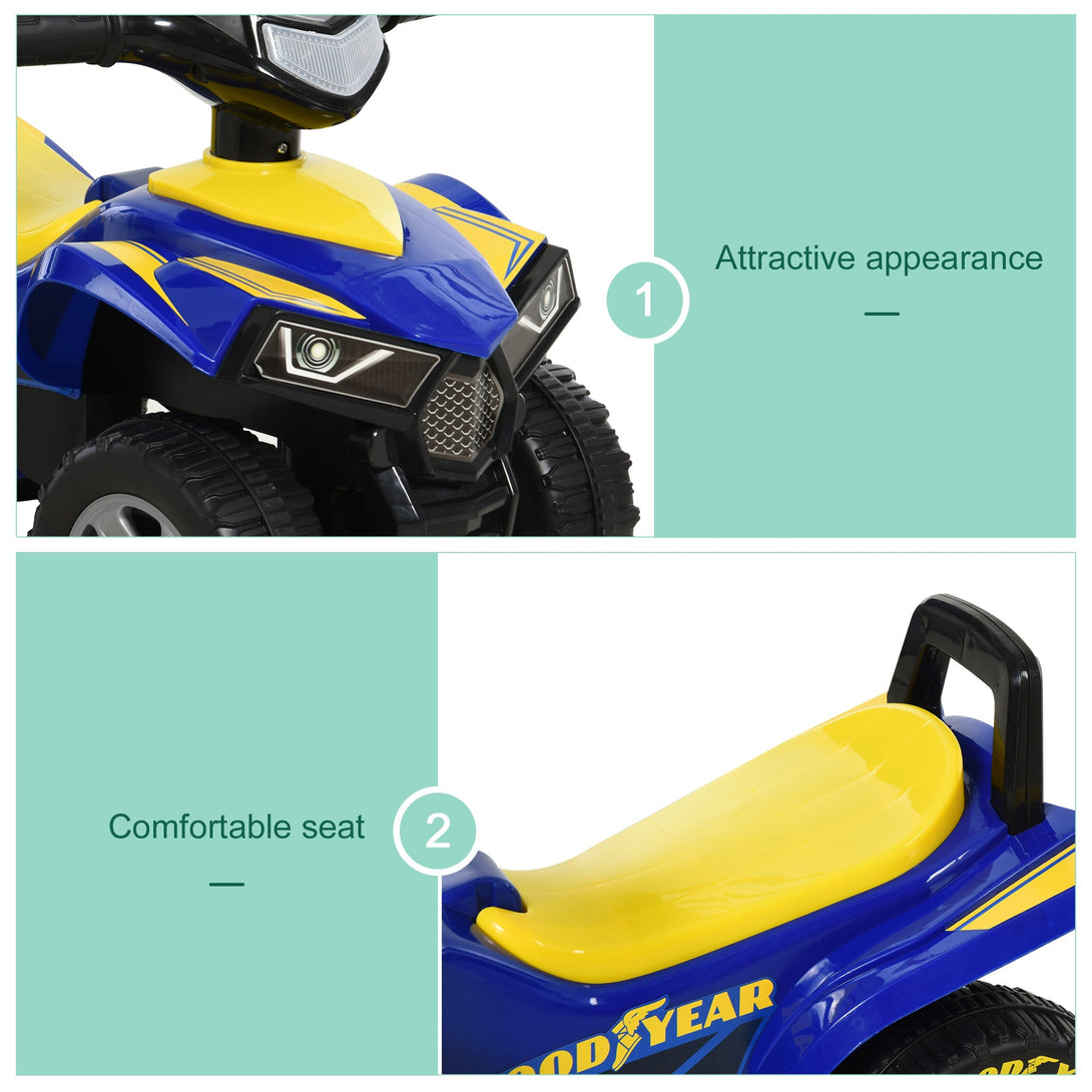 Put your child in the front seat, and in complete control of their adventures, with this foot-to-the-floor quad bike ride on from HOMCOM. Manual moving in design to encourage them to move by themselves and gain confidence in their own time, it's fitted with working lights, a horn - making it extra fun and realistic. They can move comfortably and safely, thanks to the large seat, two handlebars and four wide tyres.