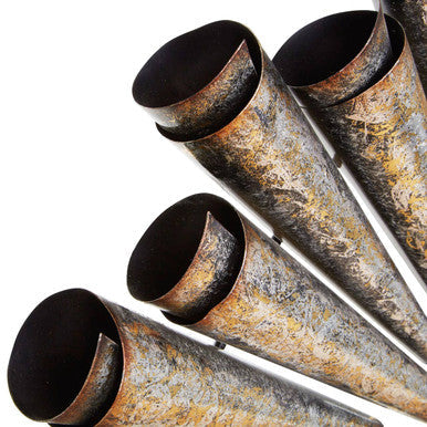 Alternating lengths of cone-shaped iron rays, with scrolled edges, radiate from the edge of the round mirror. Their distressed, mottled surface adds colour and texture, lending this mirror a reclaimed, upcycled feel. The round, central mirror features a luxurious bevelled rim. Style it with furnishings from the Tribeca range to create a coordinated, loft-style look.