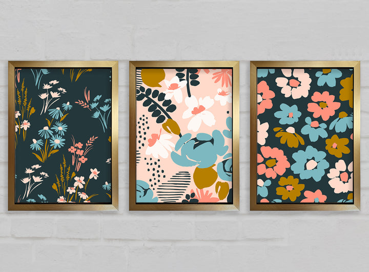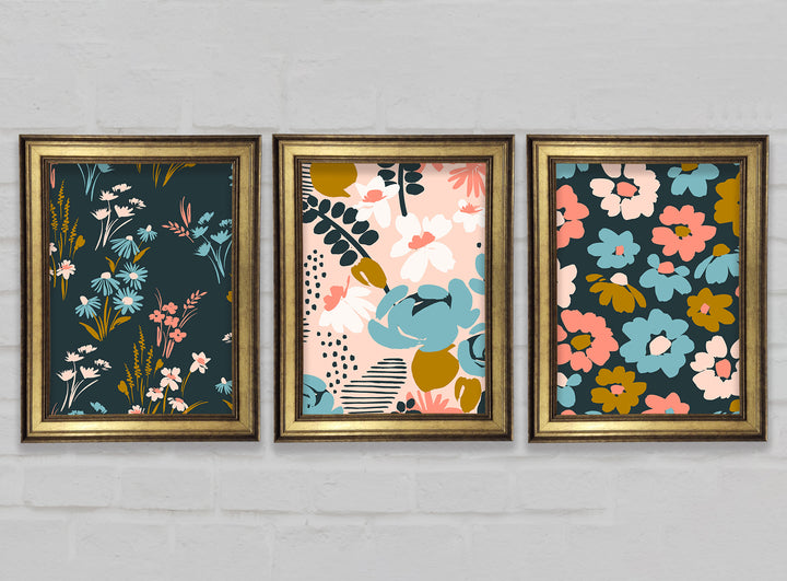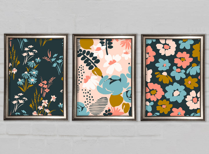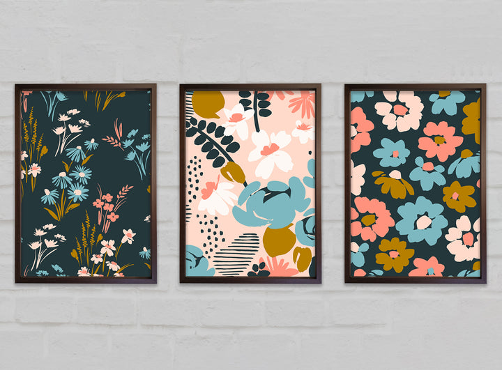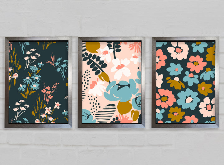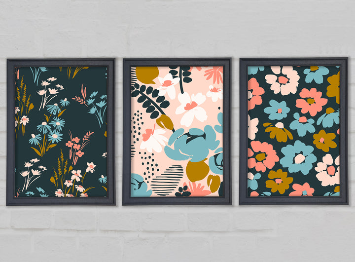 Trio of Floral Patterns set of 3 framed print wall art, available in mutiple frame colours. Ready to hang from the box and handmade in the United Kingdom.