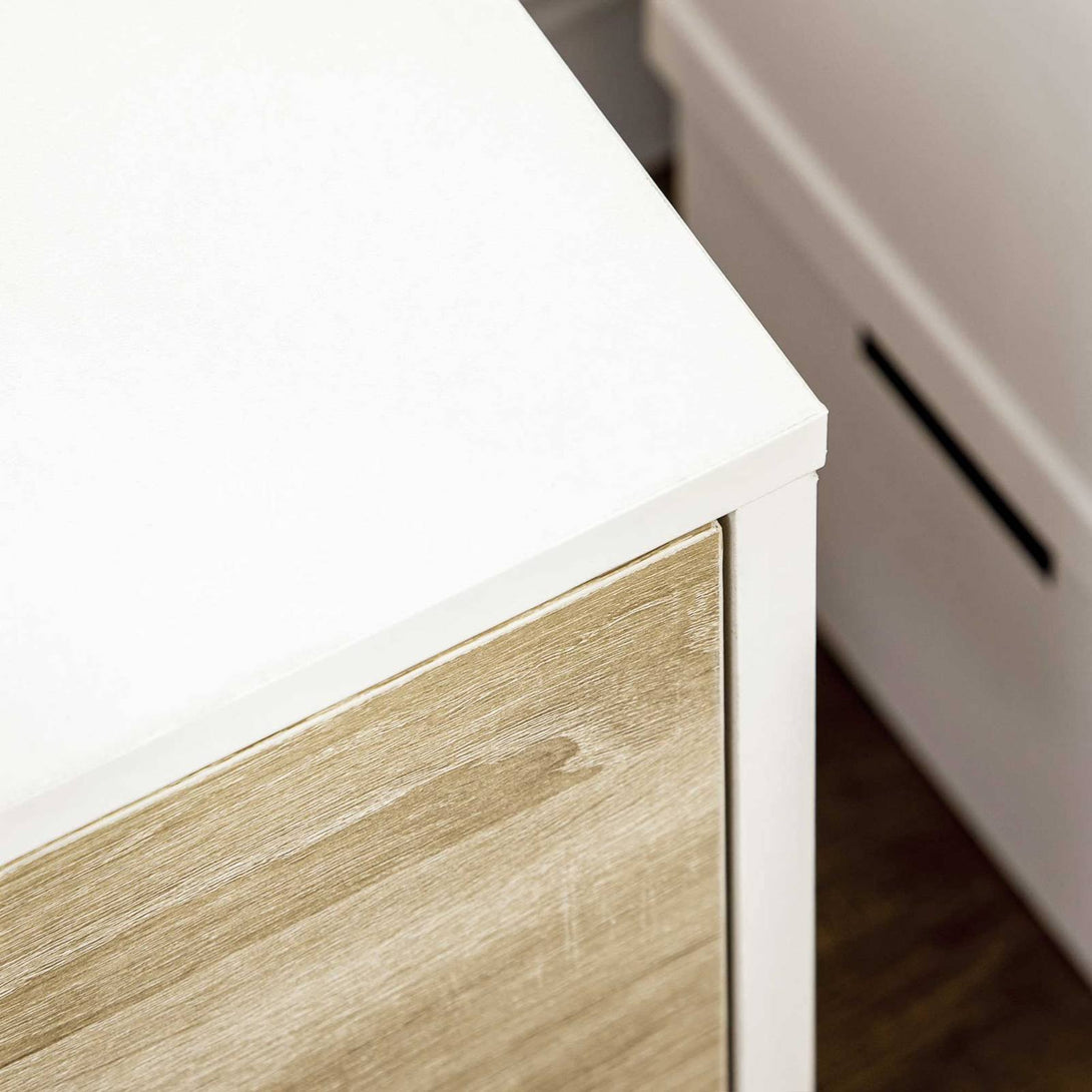 Upgrade your living room and entertainment area with this modern HOMCOM TV stand cabinet. Blending together wood effect doors and a white structure for modern style, this entertainment unit looks great all throughout the home. Formed of a wide top, middle open shelf, drawer two end cupboards. The TV console complete with wooden legs to support properly.