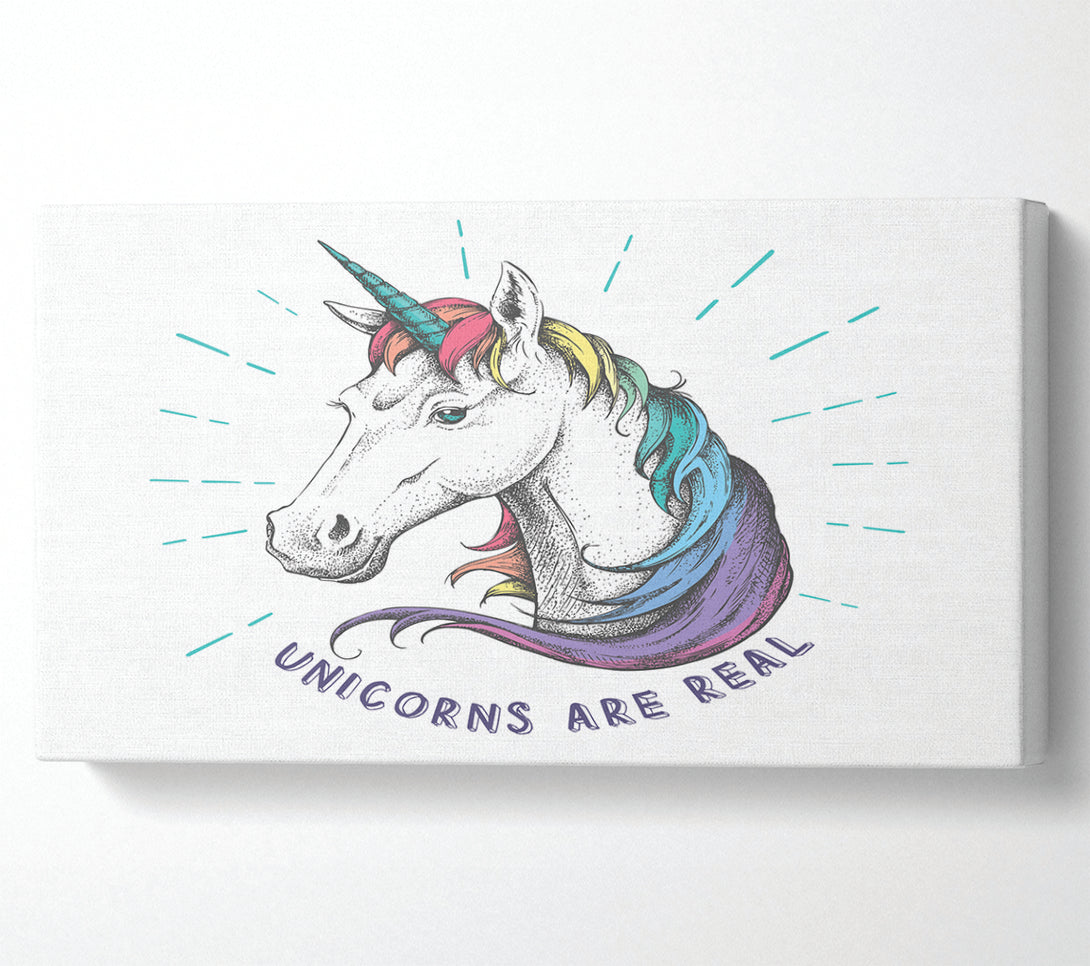 Unicorns Are Real wide canvas, printed on coated polyester canvas. Mounted on to a 44mm box frame, ready to hang.
