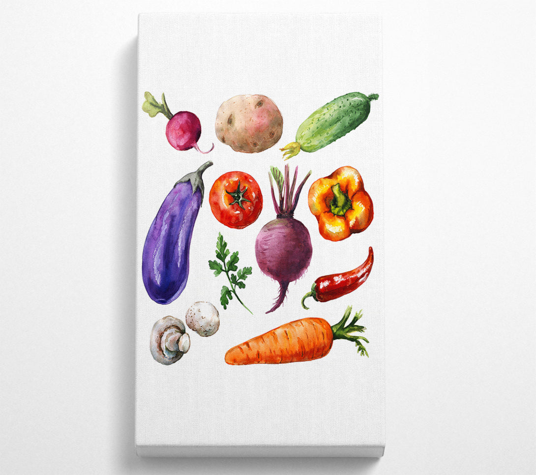 Vegetable Selection 2 wide canvas, printed on coated polyester canvas. Mounted on to a 44mm box frame, ready to hang.