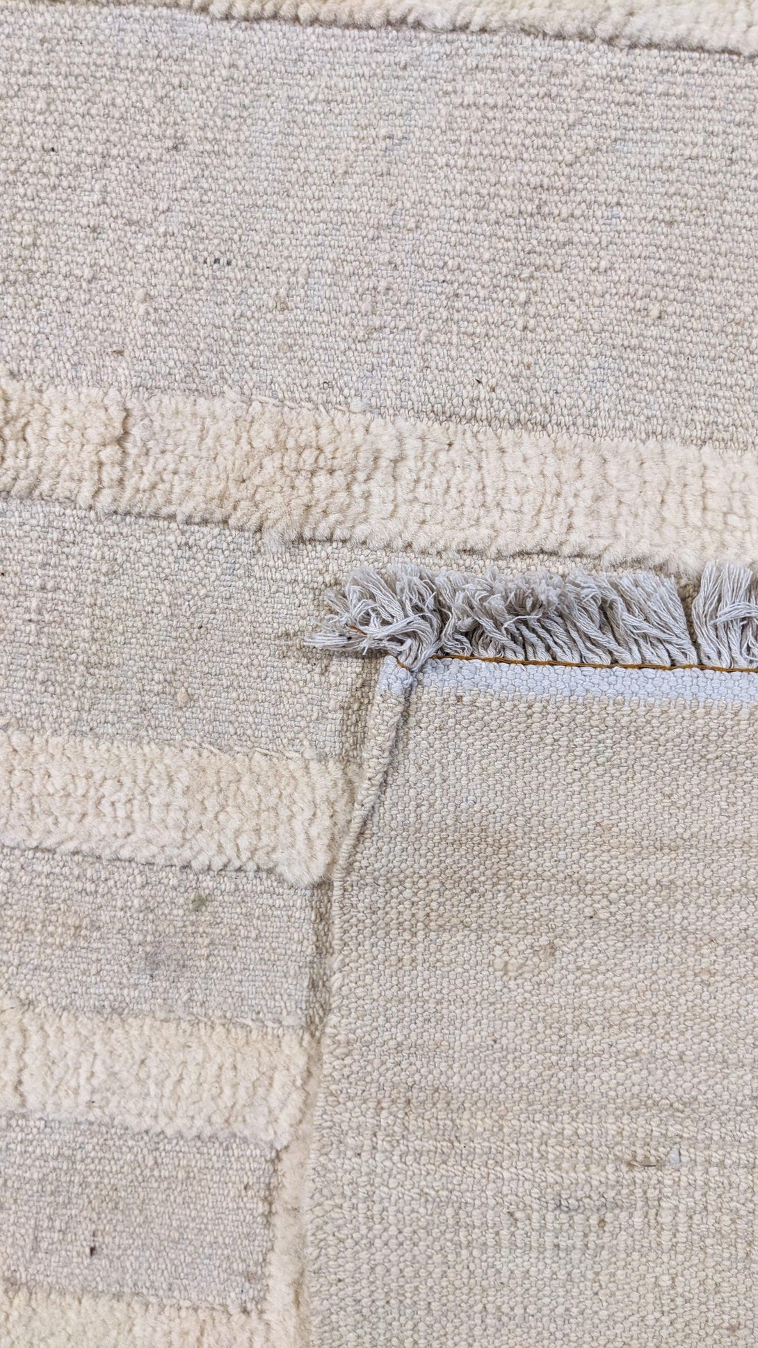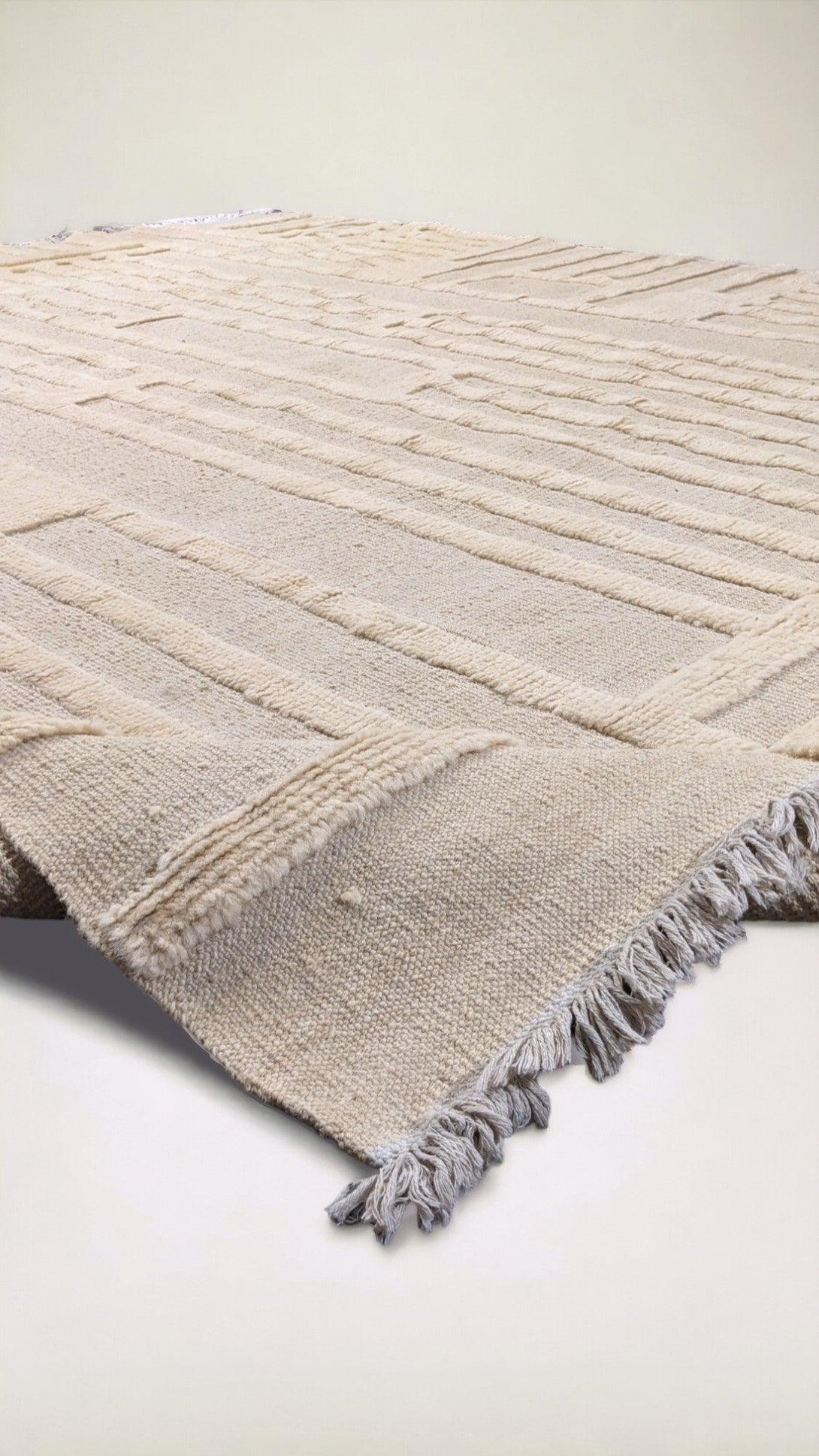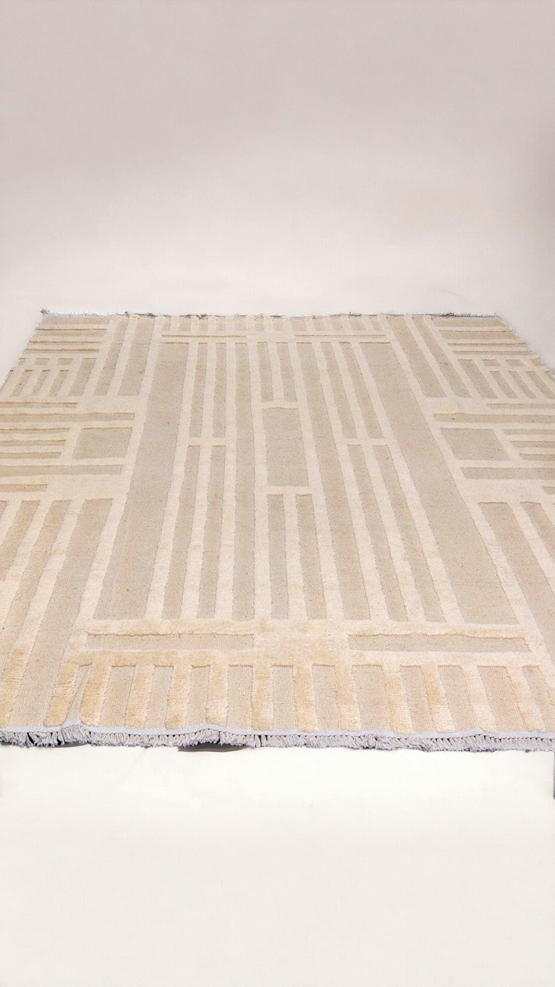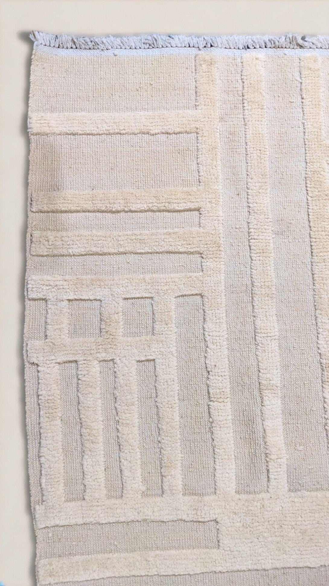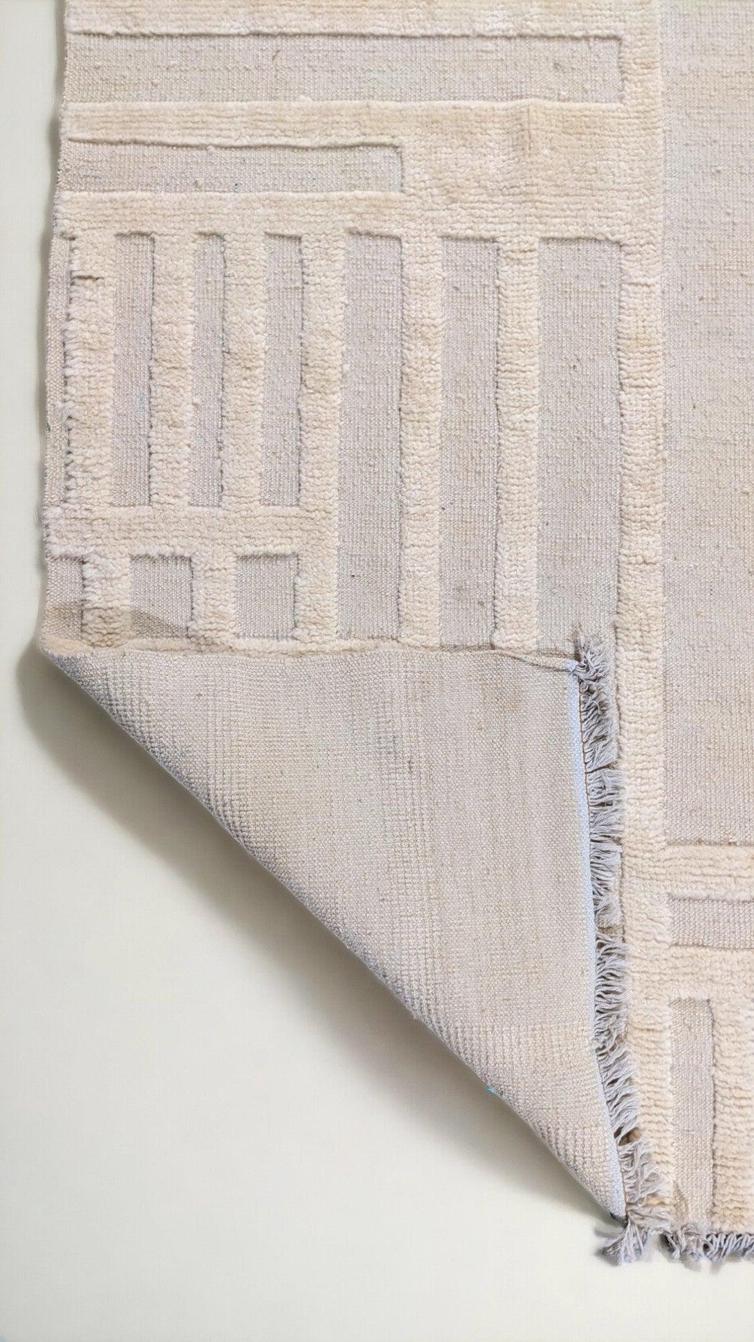 Crafted by hand using natural dyes on undyed wool, this Nordic style and versatile rug has a vivid, modern colour scheme of white and cream, and features a geometric pattern with lines and rectangles arranged symmetrically. Any space generates depth and personality from its textured appearance. Use this trendy, useful rug to update the look of your interior design.
