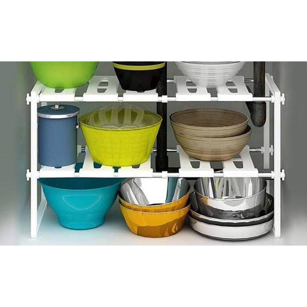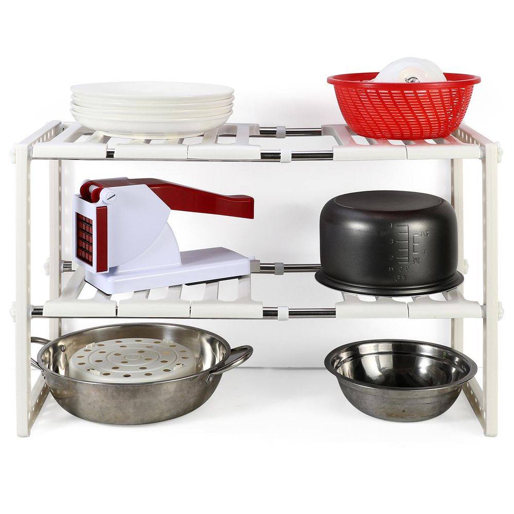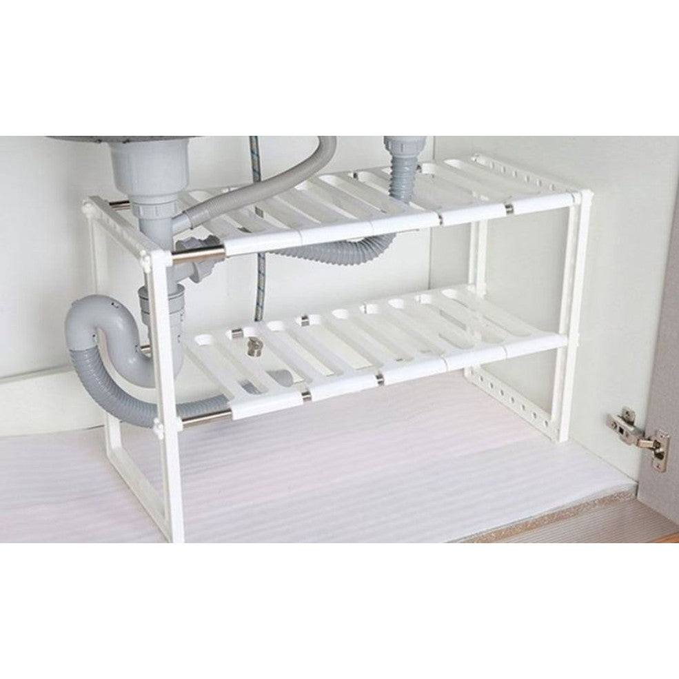FEATURES - An expandable design and a waterproof construction, this storage organiser is ideal for keeping a kitchen or bathroom cabinet tidy. This undersink organizer storage sink rack can be arranged to fit around any undersink pipe configuration adding desirable shelf space.