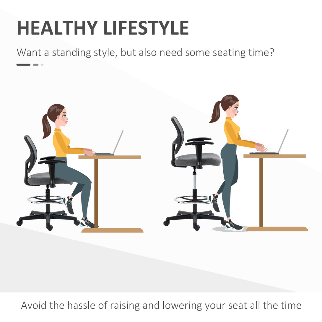 Ensure you're working comfortably when using taller surfaces with this draughtsman chair from Vinsetto. It's made from quality materials: soft fabric, thick sponge and a solid frame so it can used every day. Adjustable sturdy seat height and armrest height to cater for you, with a footrest so your legs aren't dangling. A must-have piece to increase work productivity.