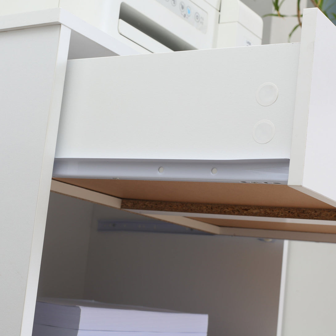 A smart go-to area for all office workers - this Vinsetto printer cabinet is the place to store stationery, refills and keep your much-needed printer. The top desktop is just the right size for the unit, with the middle shelf providing an easy-accessible place for paper. It also comes with a top drawer and two-door cupboard for storage. Made from particle board, this piece is sturdy: it's suitable for everyday use, finished with four wheels to move it around easily.