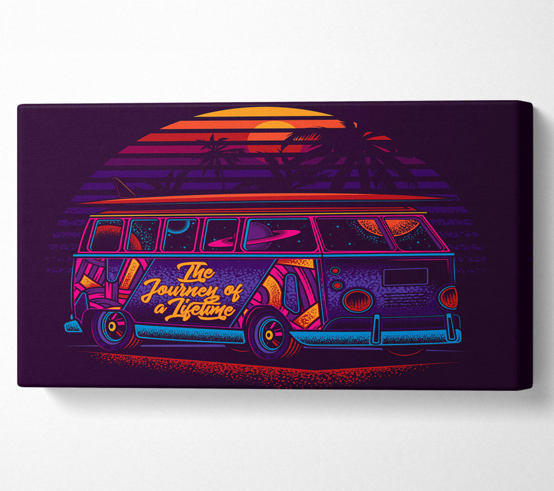 Vw Camper Surfs Up wide canvas, printed on coated polyester canvas. Mounted on to a 44mm box frame, ready to hang.