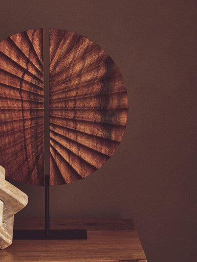This Westo sculpture is handcrafted by skilled artisans, featuring a carved natural wood disc with a radiating, segmented design. Each segment curves outwards from a central split opening, creating a dynamic sense of movement and texture. The sculpture is mounted on a contrasting, sleek black-finish metal base, adding stability and style to the design. *Due to the inherent nature of natural materials and the handmade process, slight variations in colour, grain and texture may occur.