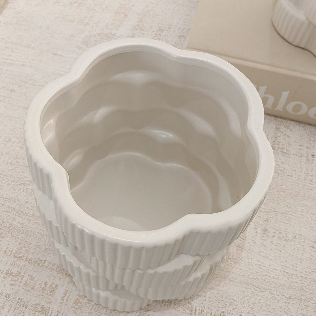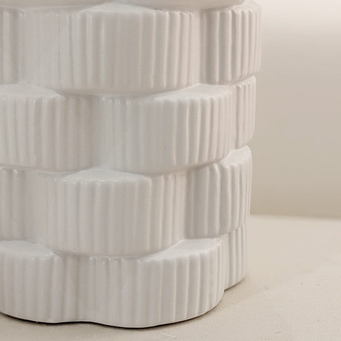 Crafted from high-quality ceramic, each vase features a unique ribbed texture design in a pristine white finish.