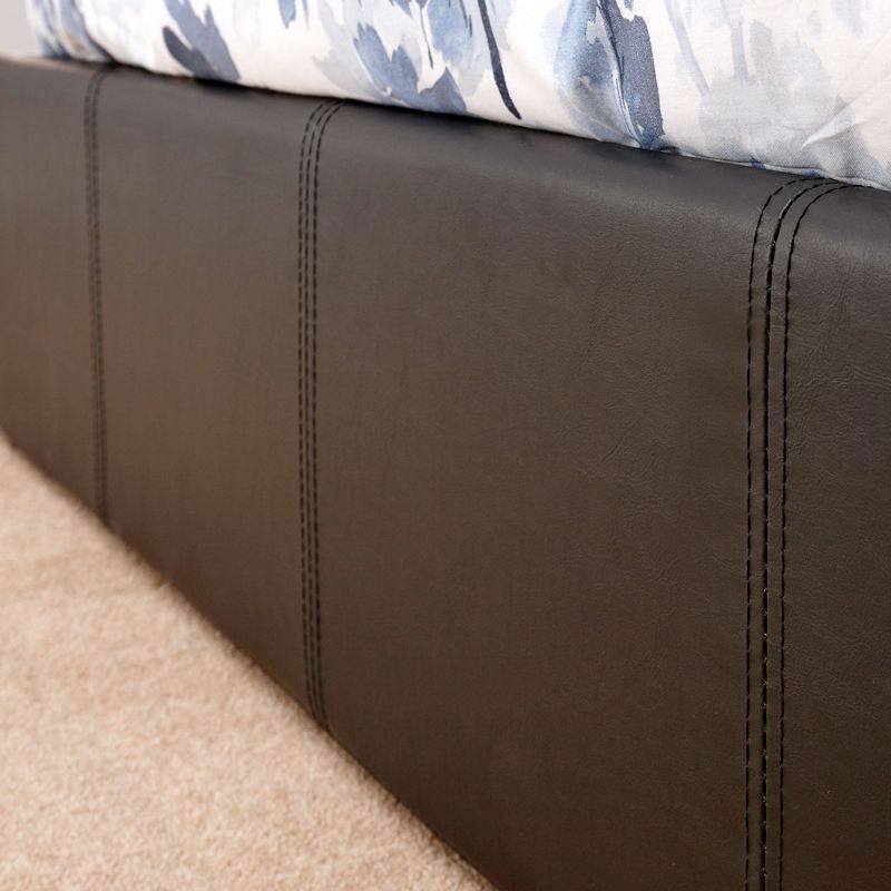This beautifully crafted frame is finished in high quality Black faux leather and complemented by a simple yet stylish stitched headboard. This is an ideal solution if space is at a premium in your bedroom as the ottoman base provides generous storage space for linen, blankets, towels or clothes. The base lifts easily with the help of a gas hydraulic system so you can access the lined storage area underneath the bed. Part of the Winston Collection.