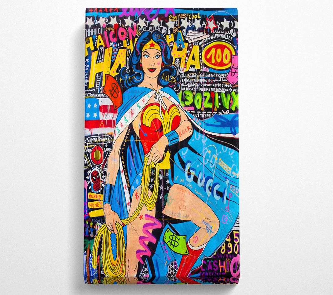 Woman Of Wonder wide canvas, printed on coated polyester canvas. Mounted on to a 44mm box frame, ready to hang.