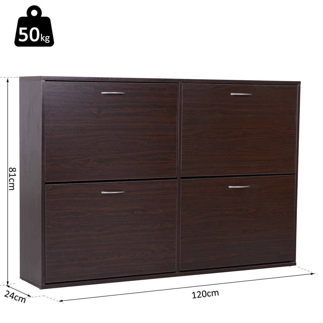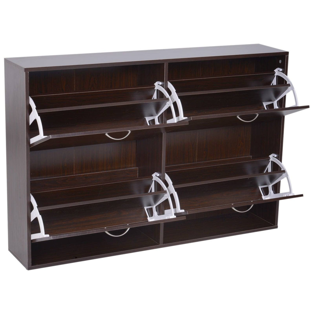 Keep all your shoes neatly organized with this compact storage cabinet from HOMCOM. In a clean brown finish, it features four separate pull-down compartments that fit six pairs of shoes each, ensuring that your home will be effortlessly clutter-free. Made from solid particle board, it will withstand daily wear in your home for many years to come. Its a great addition for all porches, hallways and entrances and will accommodating your family and friends shoes without a fuss.