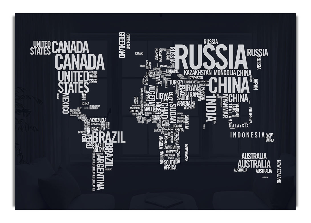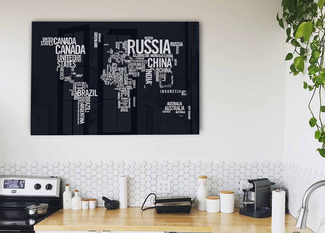 World Map Typography acrylic print, UV printed onto 5mm thick acrylic glass. Comes with everything you need to hang on your wall.