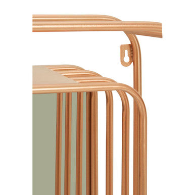 The frame of this wall mirror is made from a series of slim iron wires. Those closest to the reflective surface are banded together closely to create a sense of depth. Two lines of iron form the outer section of the frame. The iron is given a coating of faux rose gold foil that styles well with warm metallics.