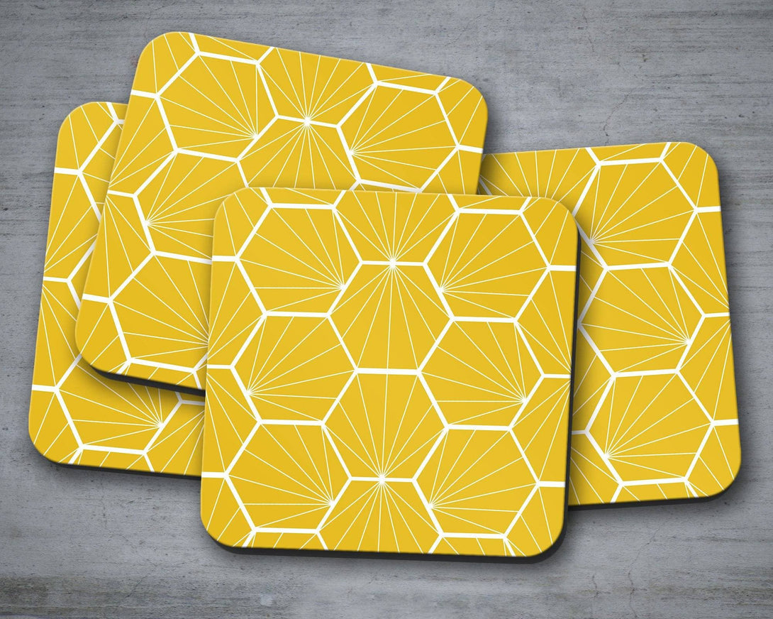 Yellow Coasters with a White Hexagon Design, Table Decor Drinks Mat