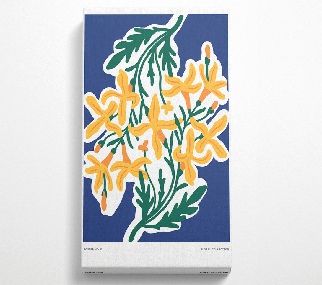 Yellow Flowers On Blue wide canvas, printed on coated polyester canvas. Mounted on to a 44mm box frame, ready to hang.