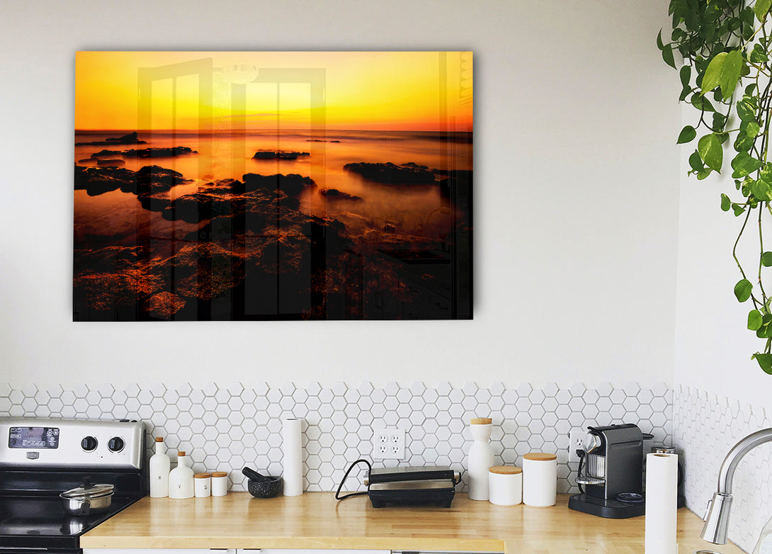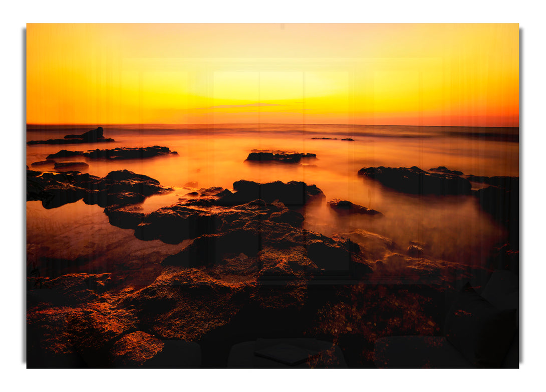 Yellow Sunset Rocks acrylic print, UV printed onto 5mm thick acrylic glass. Comes with everything you need to hang on your wall.