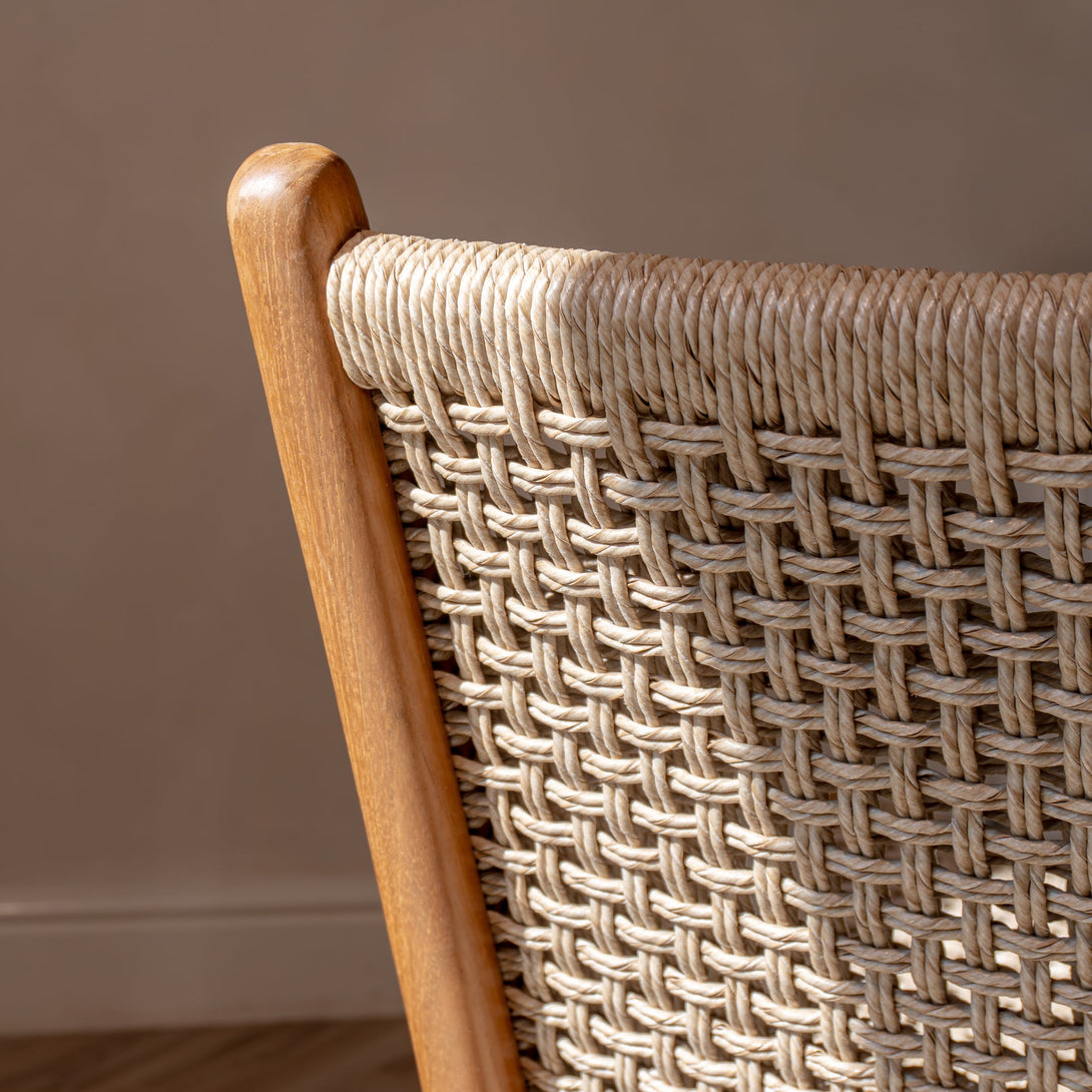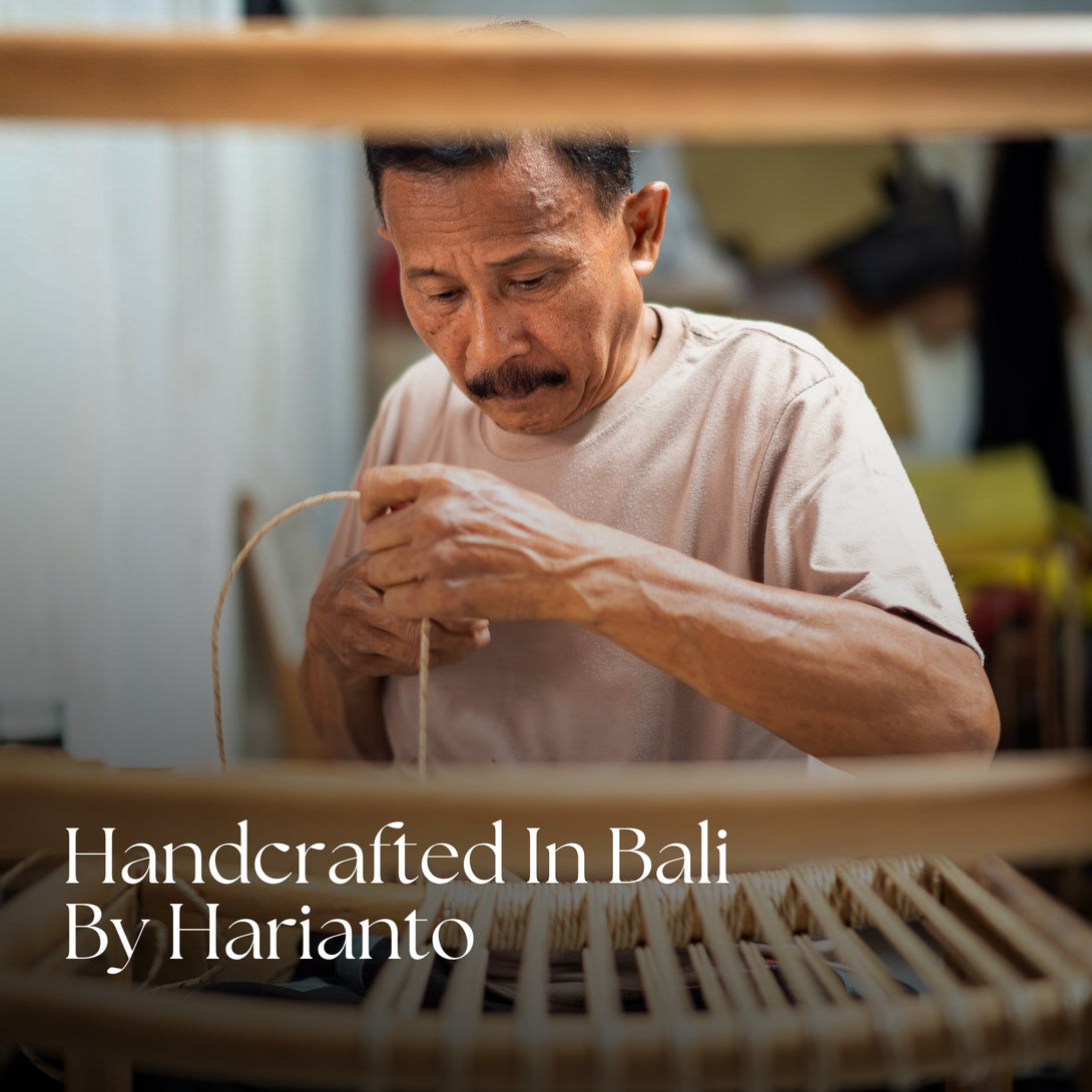 Once the frame is complete, the seat and backrest are handwoven with a durable rattan blend, chosen for its strength and gentle flexibility. Each cord is wrapped with precise tension to form a supportive weave that resists sagging, mould, and discolouration, while giving just enough natural flex for comfort.