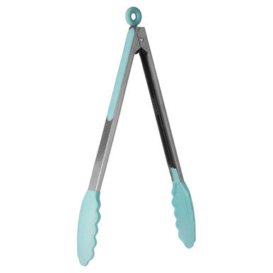 These light green tongs feature a durable stainless steel build. A circular sliding lock mechanism allows them to be held securely in position. The silicone grips are odour and stain resistant and have a scalloped design for easy picking up of items.